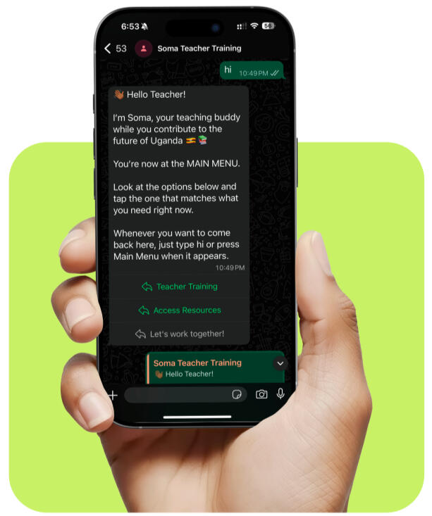 We have been working with the Ugandan Ministry of Education and Sports to develop a low-cost digital teacher training program available on WhatsApp. Using a combination of guided navigation driven pedagogy and a custom Al model trained on the Ugandan syllabus, we are able to provide teachers realtime support and opportunities for continuous learning.
